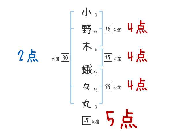 総運![]() | 小野木蛾々丸さんの総運は47画の5つ星!実力が開花し発展する円満な人生。財に恵まれる。 あなたの人生を表す1番重要な運勢です。生涯を通じて影響する総合運となり、主に50歳以降の晩年期に影響を及ぼします。 |