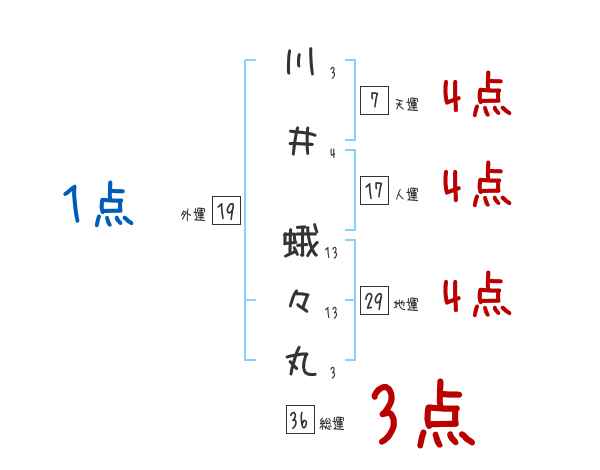 天運![]() | 川井蛾々丸さんの天運は7画の4つ星!強い意志や信念を持ち独立心が強い。自立する。 家系が持つ宿命的な運勢を表します。祖先から受け継いだ苗字ですので自分の力が及びません。家柄を象徴します。 |