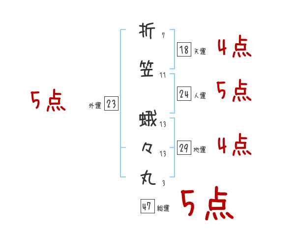 総運![]() | 折笠蛾々丸さんの総運は47画の5つ星!実力が開花し発展する円満な人生。財に恵まれる。 あなたの人生を表す1番重要な運勢です。生涯を通じて影響する総合運となり、主に50歳以降の晩年期に影響を及ぼします。 |