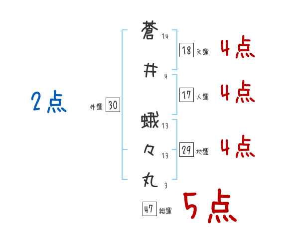 総運![]() | 蒼井蛾々丸さんの総運は47画の5つ星!実力が開花し発展する円満な人生。財に恵まれる。 あなたの人生を表す1番重要な運勢です。生涯を通じて影響する総合運となり、主に50歳以降の晩年期に影響を及ぼします。 |