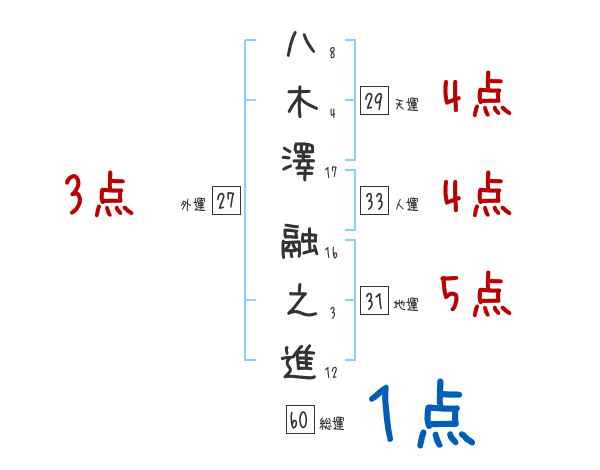 人運![]() | 八木澤融之進さんの人運は33画の4つ星!権力志向でプライドが高い。勇気があり運を切り開き成功する。 性格や才能などを表す2番目に重要な運勢です。人間関係や協調性、社会的な成功に影響します。主に20歳から50歳ぐらいまでの中年期の運勢を表します。 |