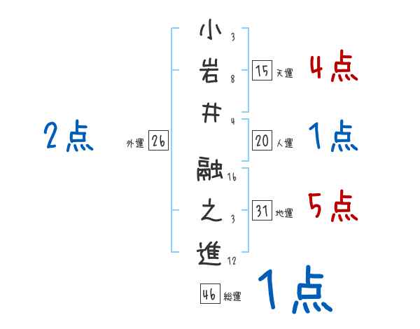 地運![]() | 小岩井融之進さんの地運は31画の5つ星!社交性があり判断力に優れる。順風満帆な人生で円満な生活。 個性を表す基礎的な運勢です。性格形成や対人関係、行動力など家庭環境に影響されます。主に誕生してから20歳くらいまでの若年期の運勢を表します。 |