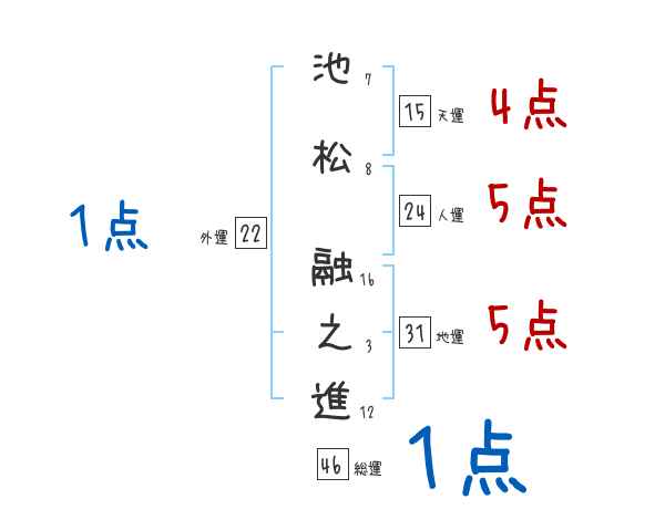 総運![]() | 池松融之進さんの総運は46画の1つ星!迷走することが多く苦労するかも。目先のことにとらわれないように。 あなたの人生を表す1番重要な運勢です。生涯を通じて影響する総合運となり、主に50歳以降の晩年期に影響を及ぼします。 |