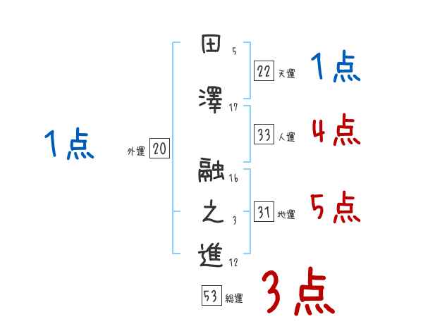 総運![]() | 田澤融之進さんの総運は53画の3つ星!やや見栄っ張りで虚栄心がある。散財に注意。 あなたの人生を表す1番重要な運勢です。生涯を通じて影響する総合運となり、主に50歳以降の晩年期に影響を及ぼします。 |