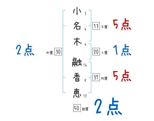 外運![]() | 小名木融香恵さんの外運は30画の2つ星!浮き沈みの激しさに注意しましょう。 生活面を象徴する運勢です。外部から受ける影響力を表し、結婚運、家庭運や職場、環境への順応性を表します。 |