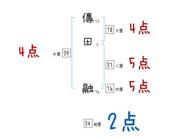 総運![]() | 傳田融さんの総運は34画の2つ星!独創性に優れるが、自尊心が強く災難に注意しましょう。 あなたの人生を表す1番重要な運勢です。生涯を通じて影響する総合運となり、主に50歳以降の晩年期に影響を及ぼします。 |