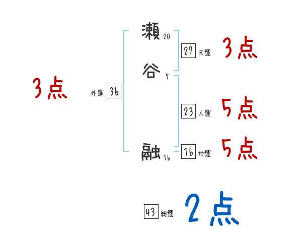天運![]() | 瀬谷融さんの天運は27画の3つ星!頭脳明晰だが強情で摩擦が多い傾向。孤立に注意。 家系が持つ宿命的な運勢を表します。祖先から受け継いだ苗字ですので自分の力が及びません。家柄を象徴します。 |