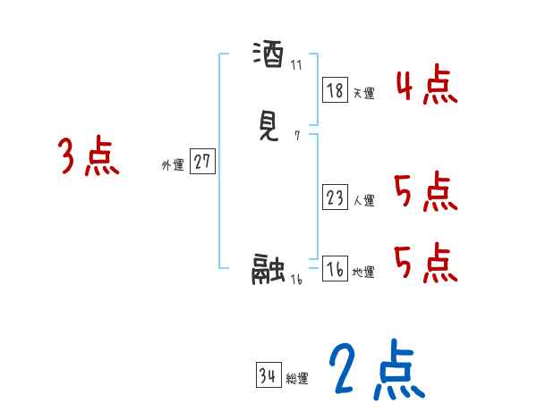 総運![]() | 酒見融さんの総運は34画の2つ星!独創性に優れるが、自尊心が強く災難に注意しましょう。 あなたの人生を表す1番重要な運勢です。生涯を通じて影響する総合運となり、主に50歳以降の晩年期に影響を及ぼします。 |
