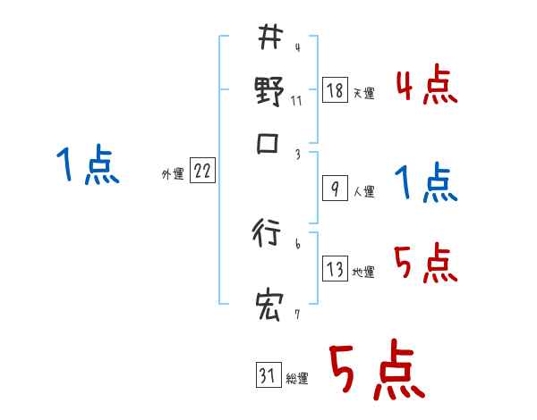 天運![]() | 井野口行宏さんの天運は18画の4つ星!情熱的で剛気。忍耐力があり信頼される。 家系が持つ宿命的な運勢を表します。祖先から受け継いだ苗字ですので自分の力が及びません。家柄を象徴します。 |