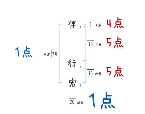 天運![]() | 伴行宏さんの天運は7画の4つ星!強い意志や信念を持ち独立心が強い。自立する。 家系が持つ宿命的な運勢を表します。祖先から受け継いだ苗字ですので自分の力が及びません。家柄を象徴します。 |