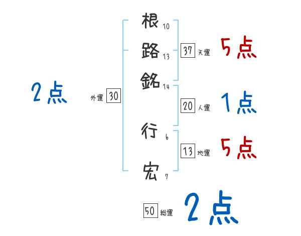 総運![]() | 根路銘行宏さんの総運は50画の2つ星!浮き沈みが激しく不安定。しりすぼみに衰退しやすいので注意しましょう。 あなたの人生を表す1番重要な運勢です。生涯を通じて影響する総合運となり、主に50歳以降の晩年期に影響を及ぼします。 |