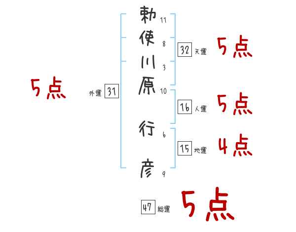人運![]() | 勅使川原行彦さんの人運は16画の5つ星!人望が厚く大きく発展する。逆転成功が見える。 性格や才能などを表す2番目に重要な運勢です。人間関係や協調性、社会的な成功に影響します。主に20歳から50歳ぐらいまでの中年期の運勢を表します。 |