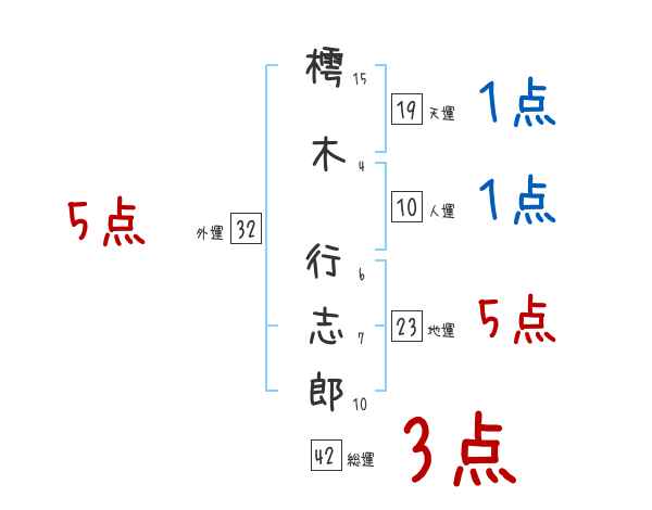 外運![]() | 樗木行志郎さんの外運は32画の5つ星!柔軟性があり成功する。チャンスが多く金運が良い。 生活面を象徴する運勢です。外部から受ける影響力を表し、結婚運、家庭運や職場、環境への順応性を表します。 |