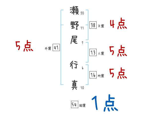総運![]() | 瀬野尾行真さんの総運は54画の1つ星!トラブルが多いかも。周りをよく見て協調して過ごしましょう。 あなたの人生を表す1番重要な運勢です。生涯を通じて影響する総合運となり、主に50歳以降の晩年期に影響を及ぼします。 |