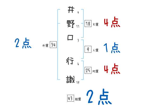 天運![]() | 井野口行識さんの天運は18画の4つ星!情熱的で剛気。忍耐力があり信頼される。 家系が持つ宿命的な運勢を表します。祖先から受け継いだ苗字ですので自分の力が及びません。家柄を象徴します。 |