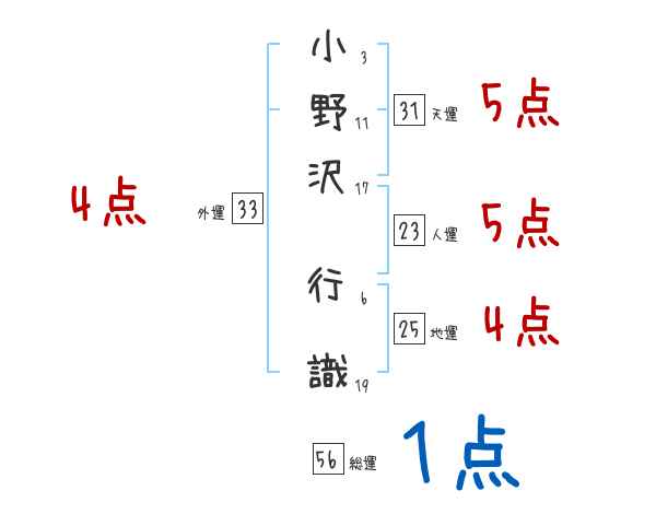 外運![]() | 小野沢行識さんの外運は33画の4つ星!権力志向でプライドが高い。勇気があり運を切り開き成功する。 生活面を象徴する運勢です。外部から受ける影響力を表し、結婚運、家庭運や職場、環境への順応性を表します。 |