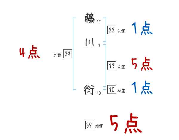 総運![]() | 藤川衍さんの総運は32画の5つ星!柔軟性があり成功する。チャンスが多く金運が良い。 あなたの人生を表す1番重要な運勢です。生涯を通じて影響する総合運となり、主に50歳以降の晩年期に影響を及ぼします。 |
