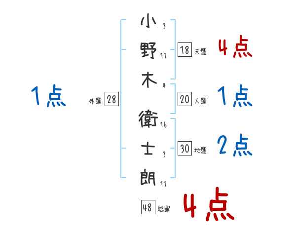 天運![]() | 小野木衛士朗さんの天運は18画の4つ星!情熱的で剛気。忍耐力があり信頼される。 家系が持つ宿命的な運勢を表します。祖先から受け継いだ苗字ですので自分の力が及びません。家柄を象徴します。 |