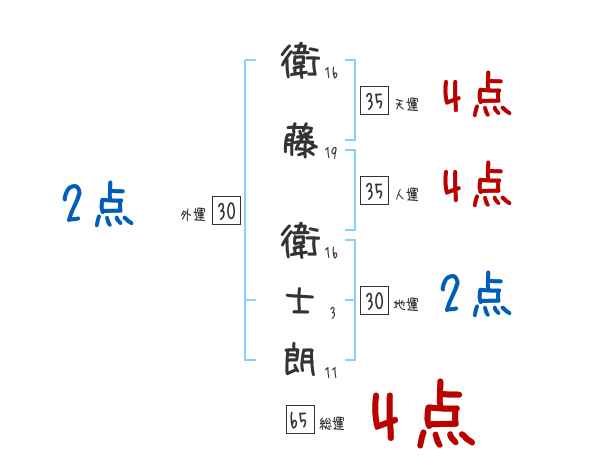 天運![]() | 衛藤衛士朗さんの天運は35画の4つ星!温厚な性格で感受性が高い。穏和な性格で人望が厚い。 家系が持つ宿命的な運勢を表します。祖先から受け継いだ苗字ですので自分の力が及びません。家柄を象徴します。 |