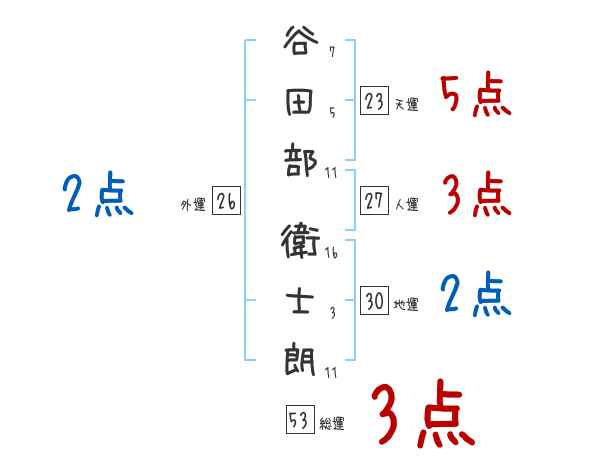総運![]()  | 谷田部衛士朗さんの総運は53画の3つ星!やや見栄っ張りで虚栄心がある。散財に注意。 あなたの人生を表す1番重要な運勢です。生涯を通じて影響する総合運となり、主に50歳以降の晩年期に影響を及ぼします。 |