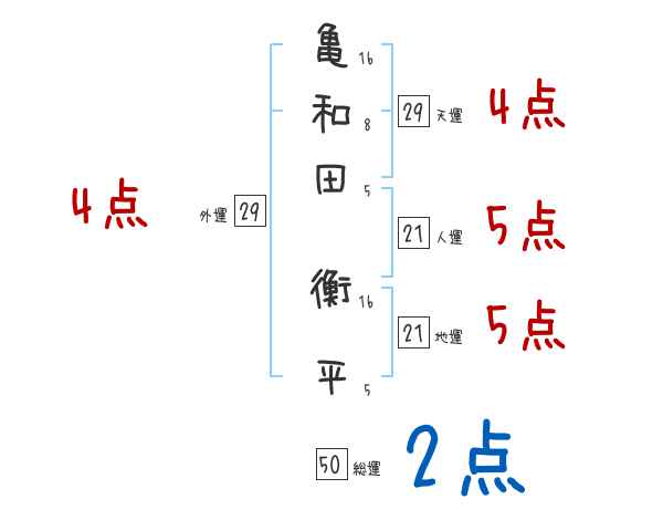 天運![]() | 亀和田衡平さんの天運は29画の4つ星!完全主義で才能がある。厳格な心の持ち主。 家系が持つ宿命的な運勢を表します。祖先から受け継いだ苗字ですので自分の力が及びません。家柄を象徴します。 |