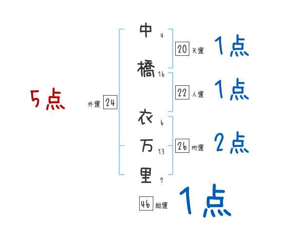 外運![]() | 中橋衣万里さんの外運は24画の5つ星!家庭運が良く順調な人生。金運にも恵まれる。 生活面を象徴する運勢です。外部から受ける影響力を表し、結婚運、家庭運や職場、環境への順応性を表します。 |
