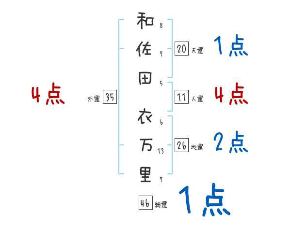 外運![]() | 和佐田衣万里さんの外運は35画の4つ星!温厚な性格で感受性が高い。穏和な性格で人望が厚い。 生活面を象徴する運勢です。外部から受ける影響力を表し、結婚運、家庭運や職場、環境への順応性を表します。 |