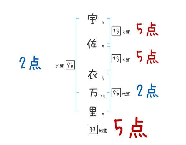 地運![]() | 宇佐衣万里さんの地運は26画の2つ星!波瀾万丈かも。信頼できる人を大事にしましょう。 個性を表す基礎的な運勢です。性格形成や対人関係、行動力など家庭環境に影響されます。主に誕生してから20歳くらいまでの若年期の運勢を表します。 |