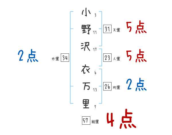 総運![]() | 小野沢衣万里さんの総運は57画の4つ星!向上心があり人望がある。地位を得る。 あなたの人生を表す1番重要な運勢です。生涯を通じて影響する総合運となり、主に50歳以降の晩年期に影響を及ぼします。 |