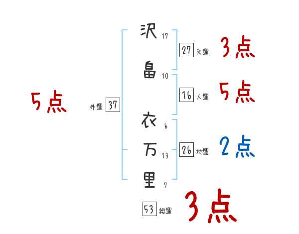 総運![]() | 沢畠衣万里さんの総運は53画の3つ星!やや見栄っ張りで虚栄心がある。散財に注意。 あなたの人生を表す1番重要な運勢です。生涯を通じて影響する総合運となり、主に50歳以降の晩年期に影響を及ぼします。 |
