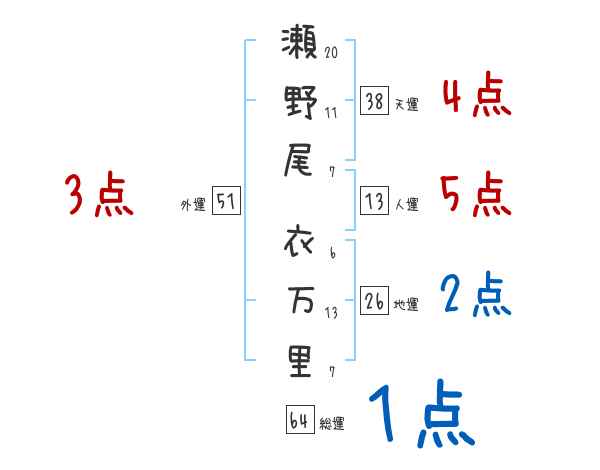 外運![]() | 瀬野尾衣万里さんの外運は51画の3つ星!変化が激しく、危険に注意。堅実な性格。 生活面を象徴する運勢です。外部から受ける影響力を表し、結婚運、家庭運や職場、環境への順応性を表します。 |
