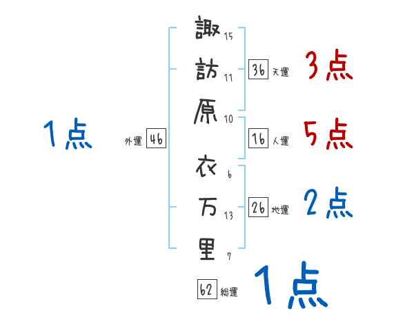 天運![]() | 諏訪原衣万里さんの天運は36画の3つ星!先見性が豊かです。多少神経質で苦労することも。 家系が持つ宿命的な運勢を表します。祖先から受け継いだ苗字ですので自分の力が及びません。家柄を象徴します。 |