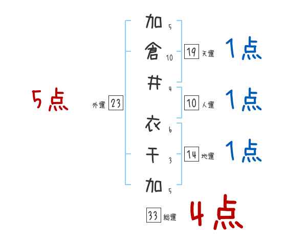 外運![]() | 加倉井衣千加さんの外運は23画の5つ星!想像力に優れ活力がある。一代で成功し名誉を手に入れる。 生活面を象徴する運勢です。外部から受ける影響力を表し、結婚運、家庭運や職場、環境への順応性を表します。 |