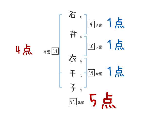 外運![]() | 石井衣千子さんの外運は11画の4つ星!着実に富や地位を得る幸運な人生。 生活面を象徴する運勢です。外部から受ける影響力を表し、結婚運、家庭運や職場、環境への順応性を表します。 |