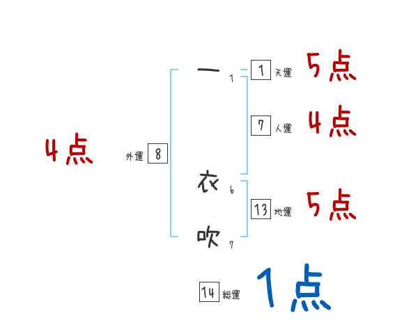 天運![]() | 一衣吹さんの天運は1画の5つ星!行動力、指導力があり出世し繁栄する。幸運に恵まれる。 家系が持つ宿命的な運勢を表します。祖先から受け継いだ苗字ですので自分の力が及びません。家柄を象徴します。 |