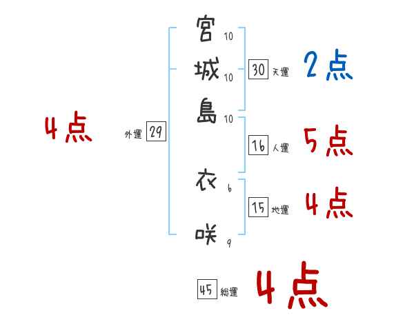 天運![]() | 宮城島衣咲さんの天運は30画の2つ星!浮き沈みの激しさに注意しましょう。 家系が持つ宿命的な運勢を表します。祖先から受け継いだ苗字ですので自分の力が及びません。家柄を象徴します。 |