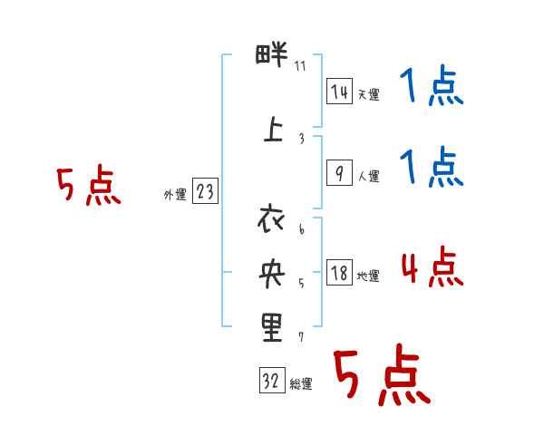 総運![]() | 畔上衣央里さんの総運は32画の5つ星!柔軟性があり成功する。チャンスが多く金運が良い。 あなたの人生を表す1番重要な運勢です。生涯を通じて影響する総合運となり、主に50歳以降の晩年期に影響を及ぼします。 |