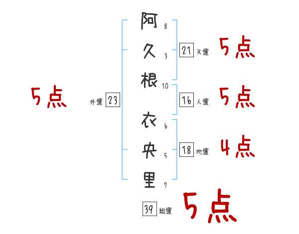 外運![]() | 阿久根衣央里さんの外運は23画の5つ星!想像力に優れ活力がある。一代で成功し名誉を手に入れる。 生活面を象徴する運勢です。外部から受ける影響力を表し、結婚運、家庭運や職場、環境への順応性を表します。 |