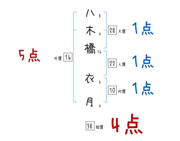 天運![]() | 八木橋衣月さんの天運は28画の1つ星!家庭環境に注意。スポーツで活躍できる能力があるかも。 家系が持つ宿命的な運勢を表します。祖先から受け継いだ苗字ですので自分の力が及びません。家柄を象徴します。 |