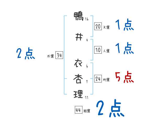 総運![]() | 鴨井衣杏理さんの総運は44画の2つ星!誠実で慎重な性格。物事を考えすぎないように注意しましょう。 あなたの人生を表す1番重要な運勢です。生涯を通じて影響する総合運となり、主に50歳以降の晩年期に影響を及ぼします。 |
