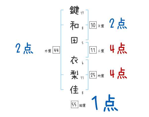 外運![]() | 鍵和田衣梨佳さんの外運は44画の2つ星!誠実で慎重な性格。物事を考えすぎないように注意しましょう。 生活面を象徴する運勢です。外部から受ける影響力を表し、結婚運、家庭運や職場、環境への順応性を表します。 |