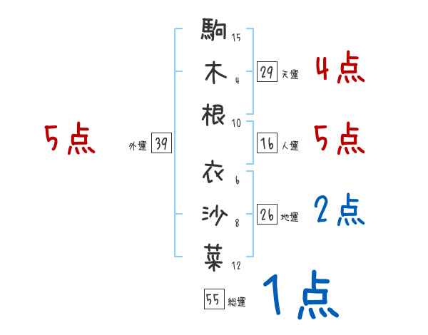 外運![]() | 駒木根衣沙菜さんの外運は39画の5つ星!社交性に優れ人望が厚い。人の上に立ち成功する。 生活面を象徴する運勢です。外部から受ける影響力を表し、結婚運、家庭運や職場、環境への順応性を表します。 |