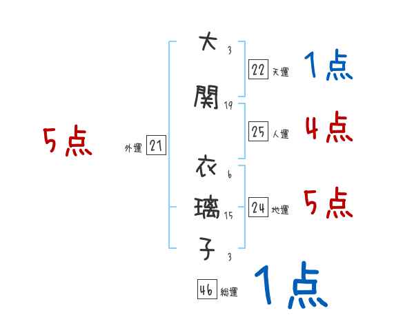 天運![]() | 大関衣璃子さんの天運は22画の1つ星!努力することが苦手ないっぽう手先が器用。芸術性にも優れる。 家系が持つ宿命的な運勢を表します。祖先から受け継いだ苗字ですので自分の力が及びません。家柄を象徴します。 |