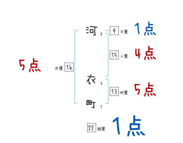 天運![]() | 河衣町さんの天運は9画の1つ星!消極的で才能を発揮することが苦手なことも。周りの意見に耳を傾けましょう。 家系が持つ宿命的な運勢を表します。祖先から受け継いだ苗字ですので自分の力が及びません。家柄を象徴します。 |