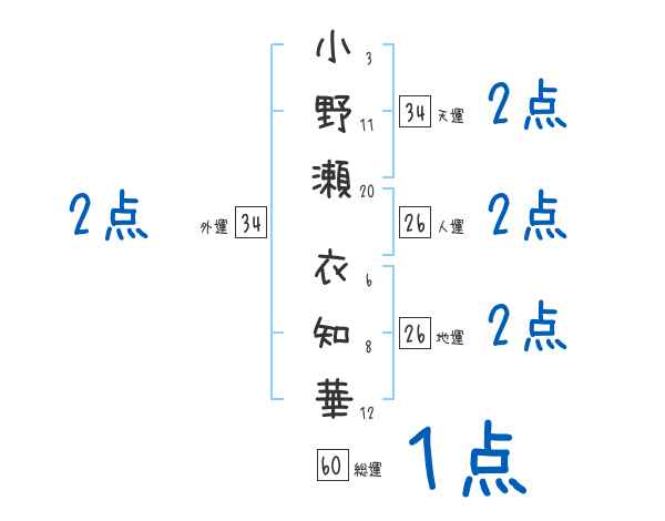 総運![]() | 小野瀬衣知華さんの総運は60画の1つ星!悲観的で迷いやすい。波乱が多く損をしないように。 あなたの人生を表す1番重要な運勢です。生涯を通じて影響する総合運となり、主に50歳以降の晩年期に影響を及ぼします。 |