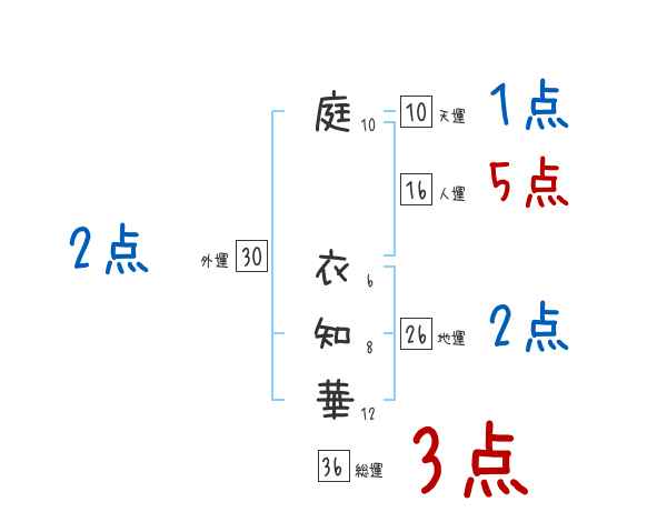 人運![]() | 庭衣知華さんの人運は16画の5つ星!人望が厚く大きく発展する。逆転成功が見える。 性格や才能などを表す2番目に重要な運勢です。人間関係や協調性、社会的な成功に影響します。主に20歳から50歳ぐらいまでの中年期の運勢を表します。 |