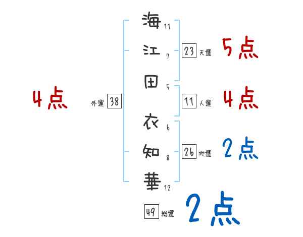 天運![]() | 海江田衣知華さんの天運は23画の5つ星!想像力に優れ活力がある。一代で成功し名誉を手に入れる。 家系が持つ宿命的な運勢を表します。祖先から受け継いだ苗字ですので自分の力が及びません。家柄を象徴します。 |