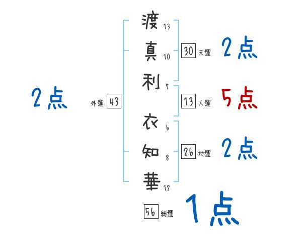 天運![]() | 渡真利衣知華さんの天運は30画の2つ星!浮き沈みの激しさに注意しましょう。 家系が持つ宿命的な運勢を表します。祖先から受け継いだ苗字ですので自分の力が及びません。家柄を象徴します。 |