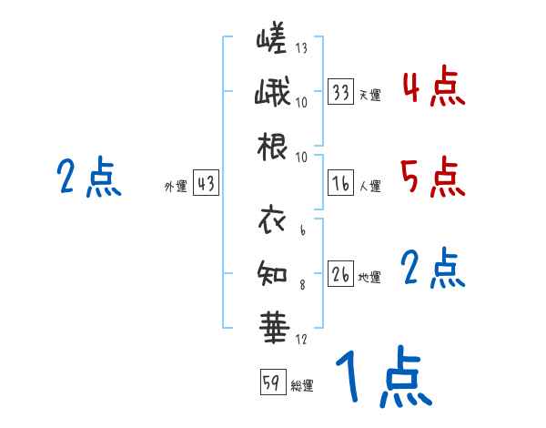 天運![]() | 嵯峨根衣知華さんの天運は33画の4つ星!権力志向でプライドが高い。勇気があり運を切り開き成功する。 家系が持つ宿命的な運勢を表します。祖先から受け継いだ苗字ですので自分の力が及びません。家柄を象徴します。 |