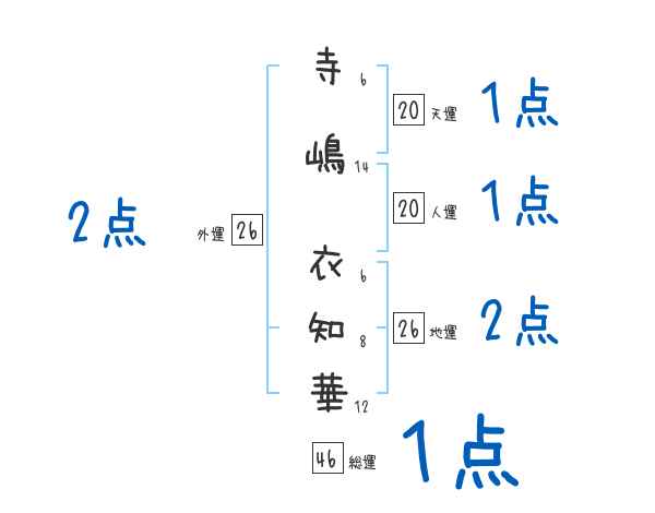 外運![]() | 寺嶋衣知華さんの外運は26画の2つ星!波瀾万丈かも。信頼できる人を大事にしましょう。 生活面を象徴する運勢です。外部から受ける影響力を表し、結婚運、家庭運や職場、環境への順応性を表します。 |